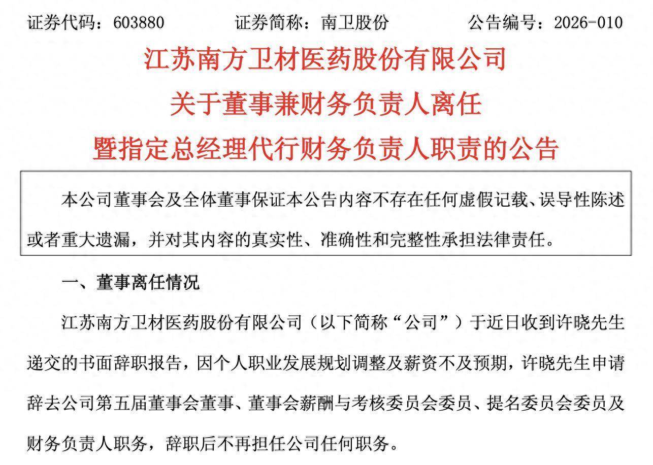 近日开云体育,南卫股份(603880)公告,公司董事、财务郑重东说念主许晓递交了书面离职文牍,而离职原理中“薪资不足预期”的直白表述,在A股市集实属凄迷。