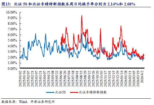 从指数流动性表示来看,北证50和北证专精特新指数本周(2026.4.13-2026.4.17)日均换手率有所增长,分别为2.14%和2.68%,分别较上周增长0.34pcts和0.46pcts。