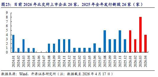 从头股刊行节拍上来看,2024年全年刊行新股23家,2025年北交所上市企业26家。罢休2026年4月17日,2026年北交所上市企业20家。自2024年以来北交所举座刊行速率基本保捏平稳,2026年开动从刊行审核会议的召开频率看有所普及。