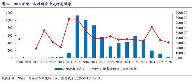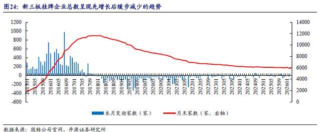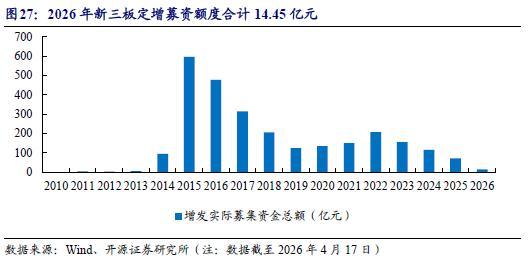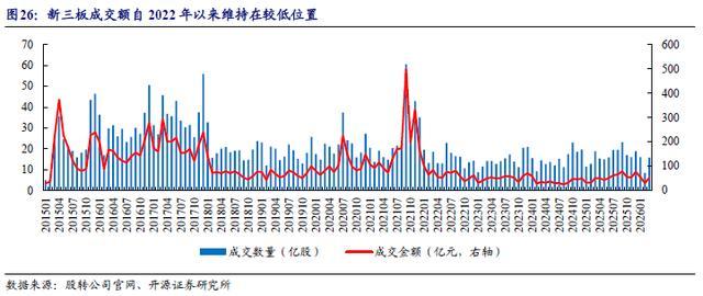 流动性方面,新三板月成交额在2015-2017年保管在较高位置,月成交额均值分别为159.22亿元、159.36亿元、189.32亿元,随后有所下滑至70亿元高下,2020年建设精选层,月成交额均值回升至107.89亿元,2021年进一步增长至179亿元,随后渐渐下滑,2024年月成交额均值达到2015年以来的最低值37.55亿元,2026年3月成交额为52.45亿元。