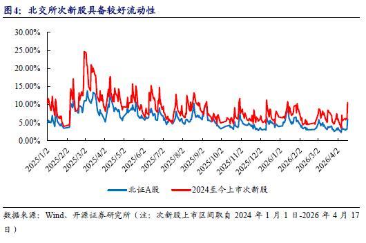 从流动性方面来看,北交所次新股具备较好流动性,2026年于今北交所次新股换手率均值达6.85%,高于北证A股举座2.52Pcts。