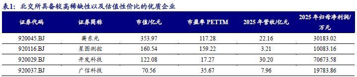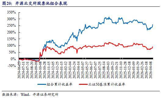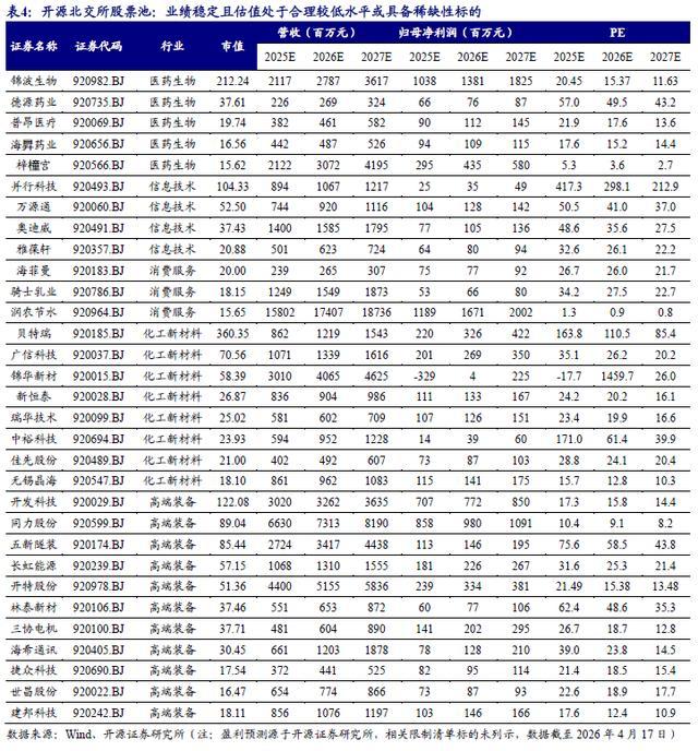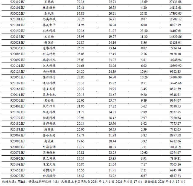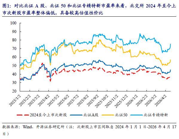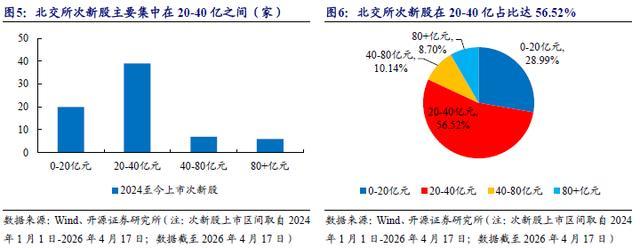 2026年4月17日,10家基金公司不竭发布了北证50指数基金家具份额上限由5亿份放宽至15亿份的公告,有助于畅达中弥远资金入市渠谈,优化资金结构,增强市集韧性,为调动式中小企业注入褂讪资金,同期有望扩容北交所公募家具供给,完善指数基金家具矩阵,倨傲种种投资者建设需求。咱们以为不错关爱2024年于今上市的北交所高稀缺性的优质次新股,现时已插足高性价比建设区间,估值方面来看,次新股股价较上市高点大宗显贵回撤,估值处于板块低位,有安全边缘。罢休2026年4月17日,北交所次新股PETTM为38.75X,位于2024年于今17.40%分位点,对比北证A股、北证50和北证专精特新市盈率来看,次新股市盈率举座偏低。从流动性分别来看,北交所次新股具备较好流动性,2026年于今北交所次新股换手率均值达6.85%,高于北证A股举座2.52Pcts。从市值方面来看,北交所次新股总市值2591.15亿元,占比北证A股总市值29.03%,其中主要靠拢在20-40亿之间,占比达56.52%,市值超100亿的企业有蘅东光、星图测控、天工股份、开发科技,市值分别为353.97亿元、160.54亿元、142.13亿元、122.08亿元。从营收和利润体量来看,北交所次新2025年营收和归母净利润占比北证A股25.82%、56.89%,其中营收和归母净利润均值和中值均优于北证A股举座。