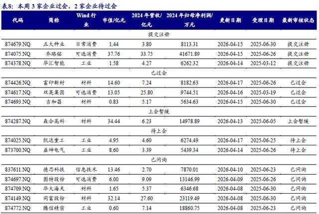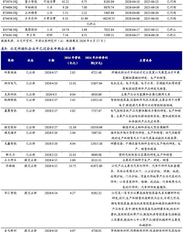 罢休2026年4月17日,北交所已过会未申购企业中待上市企业32家;已注册企业9家;提交注册企业15家;已过会企业8家。