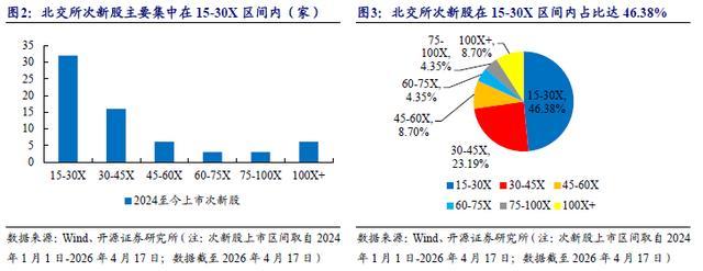 从估值方面来看,罢休2026年4月17日,北交所次新股主要靠拢在15-30X区间内,共有32家,占比46.38%。举座来看,北交所次新股在15-30X、30-45X、45-60X、60-75X、75-100X、100X+数目分别为32家、16家、6家、3家、3家、4家;占比分别为46.38%、23.19%、8.70%、4.35%、4.35%、5.80%。