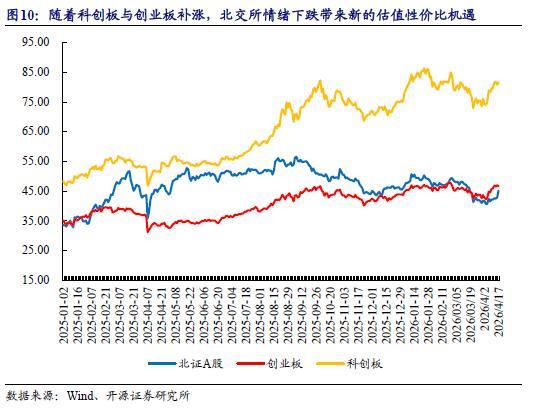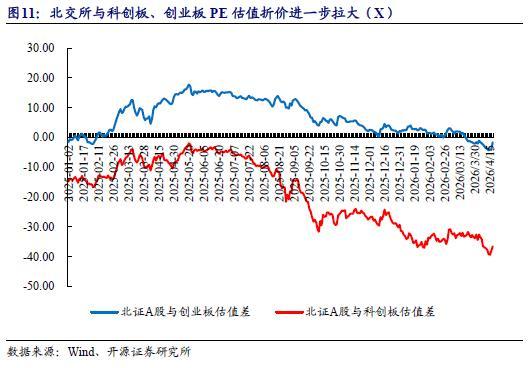 从估值方面来看,跟着科创板与创业板补涨,北交所下降带来新的估值性价比机遇。罢休2026年4月17日,北交所、创业板、科创板市盈率TTM分别为45.09X、46.67X、81.60X,举座来看北交所与创业板估值差对比由溢价向折价渐渐接近,估值差达-1.58X;与科创板估值折价进一步拉大,估值差达-36.51X。