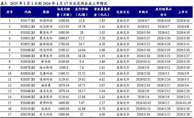 其中,2026年4月13日~2026年4月17日北交所2026年第19家和20家企业创达新材和恒谈科技在北交所上市。