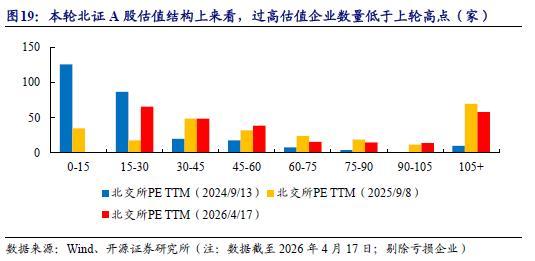 与上轮北证50高点2025年9月8日比拟,北交所PETTM在0-30X的公司数目增长14家,PETTM逾越45X的企业数目减少15家,其中PETTM逾越90X的企业数目减少10家。