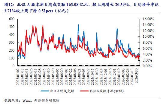 从流动性表示来看,北证A股本周(2026.4.13-2026.4.17)日均成交额163.08亿元,较上周增长20.39%,日均换手率达3.71%较上周下滑0.51pcts。
