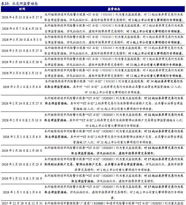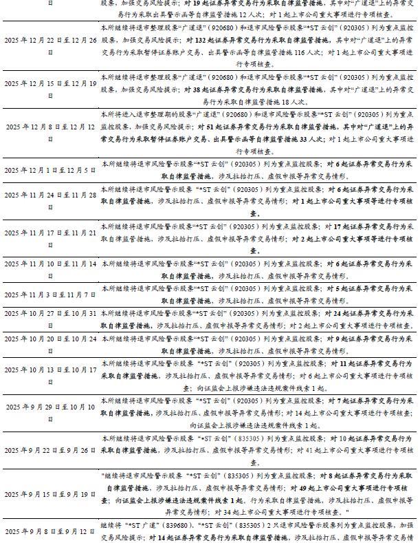 2026年4月13日至4月17日,本所不竭将退市风险警示股票“*ST云创”(920305)列为重心监控股票;对15起证券极端来往行动禁受自律监管措施,波及拉抬打压、失误陈说等极端来往情形;对8起上市公司紧要事项进行专项核查。