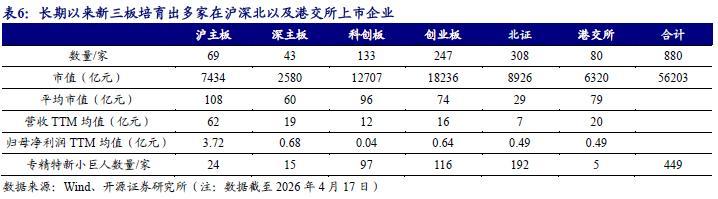 弥远以来新三板栽培出多家在沪深北以及港交所上市企业。罢休2026年4月17日,新三板分别栽培出在沪主板、深主板、科创板、创业板、北证、港交所上市企业69家、43家、133家、247家、308家、80家,其中专精特新小巨东谈主有24家、15家、97家、116家、192家、5家,罢休2026年4月17日,总市值分别7434亿元、2580亿元、12707亿元、18236亿元、8926亿元、6320亿元。