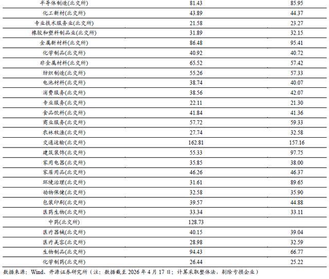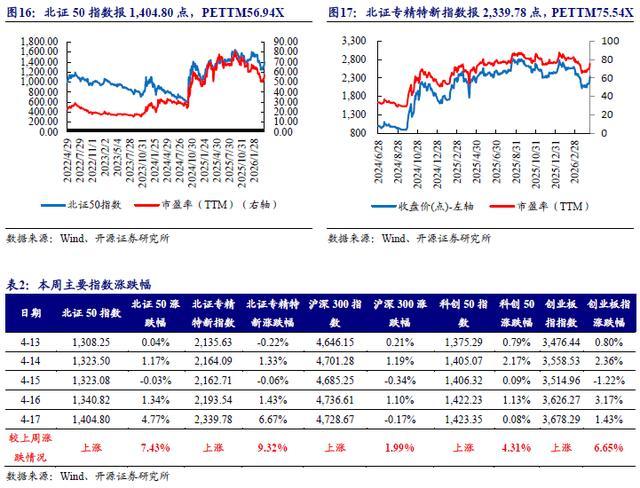 从指数表示对比来看,创业板指、沪深300、北证50、北证专精特新、科创50高涨。罢休本周(2026.4.17),北证50指数报1,404.80点,较上周涨跌+7.43%,指数PETTM56.94X;北证专精特新指数报2,339.78点,较上周涨跌+9.32%,指数PETTM75.54X;沪深300指数报4,728.67点,较上周涨跌+1.99%;科创50指数报1,423.35点,较上周涨跌+4.31%;创业板指数报3,678.29点,较上周涨跌+6.65%。