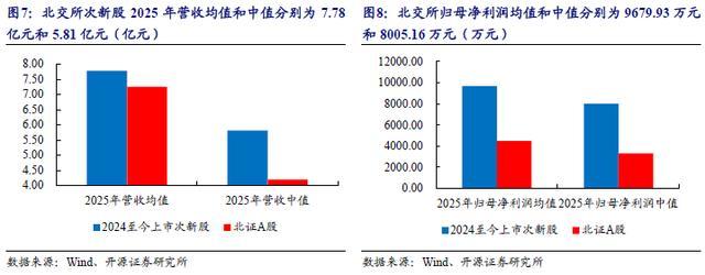 从营收和利润体量来看,北交所次新2025年营收和归母净利润占比北证A股25.82%、56.89%,其中营收和归母净利润均值和中值均优于北证A股举座,营收均值和中值分别为7.78亿元和5.81亿元,归母净利润均值和中值分别为9679.93万元和8005.16万元。
