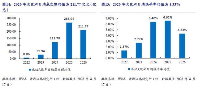 从年均流动性来看,罢休2026年4月17日2026年北交所日均成交额均值为211.77亿元,日均换手率均值为4.33%。