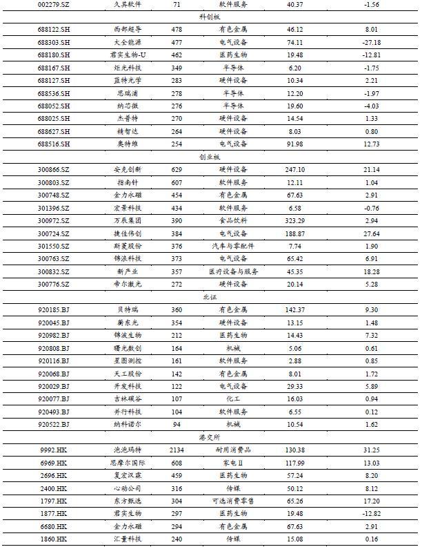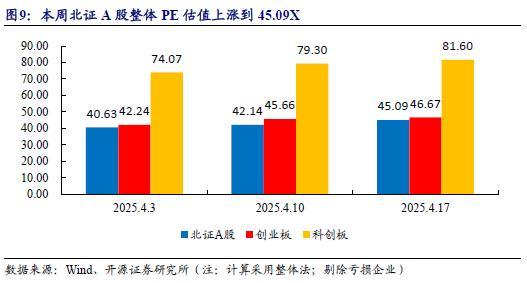 本周,北证A股、创业板、科创板估值高涨。科创板举座PE估值从79.30X高涨到81.60X,创业板举座PE由45.66X高涨到46.67X,北证A股举座PE由42.14X高涨到45.09X。