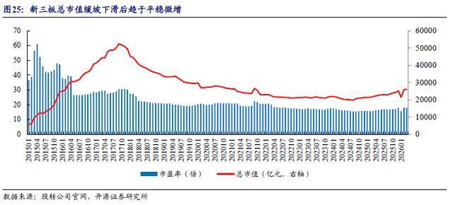 相当令辰段内,新三板总市值从2015年1月底的5591.64亿元普及至2017年9月底的高点52452.6亿元,对应市盈率为30.65倍,随后总市值渐渐回落至20000亿元近邻,2024年8月下降至19784.1亿元。罢休2026年3月底,新三板总市值为26109.54亿元,对应市盈率为17.88倍。