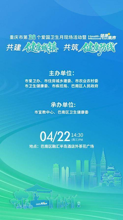 4月22日,由重庆市爱卫办、市住房城乡建委、市农业农村委、市卫生健康委、市疾控局、巴南区东谈主民政府专揽的重庆市第38个爱国卫生月暨寰宇健康城镇创建活动将在巴南区融汇半岛举行。今日,重庆健康集市“健康城镇创建专场”也将开市。