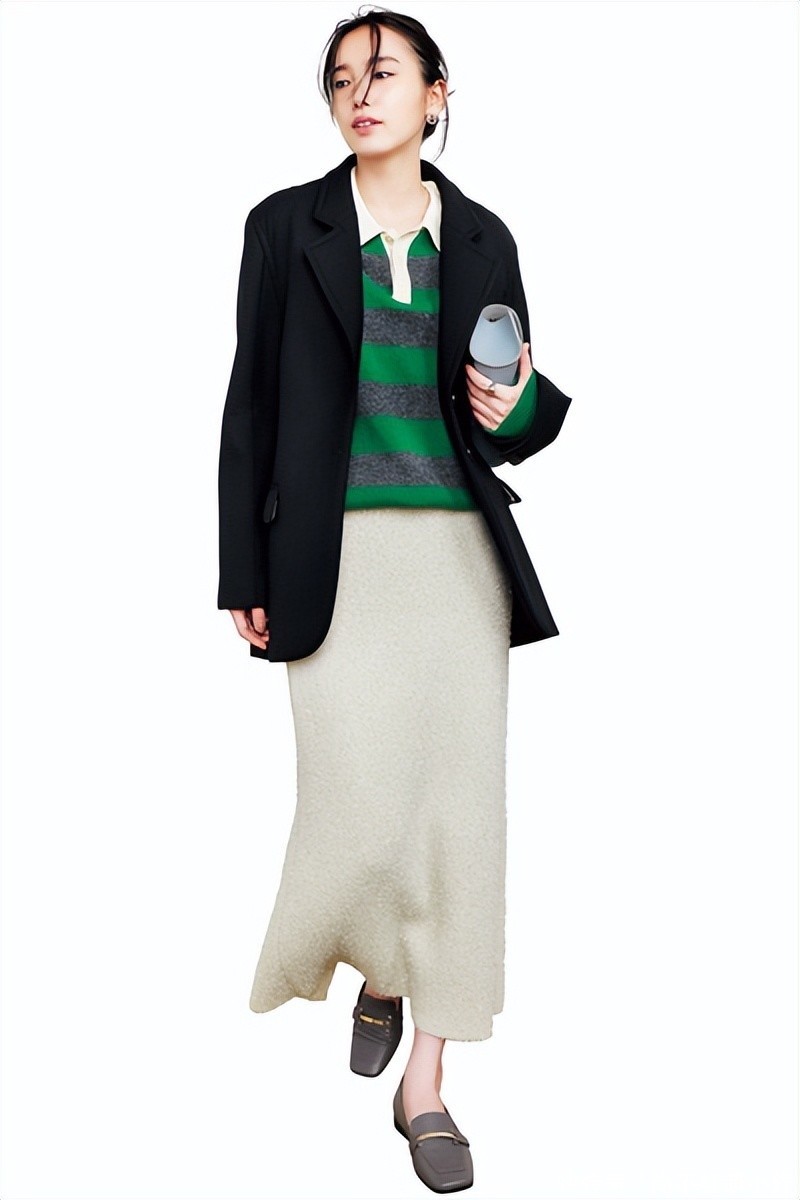 这套搭配look交融了预防与力量。米色半裙轻柔优雅,条纹Polo衫注入失业活力,外搭玄色西装霎时普及结构感。刚柔并济的混搭,收缩把握通勤与泛泛,穿出不精深的斯文。