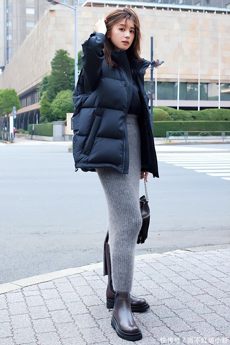 一条灰色真挚裙子,腰部高,长长的空洞会产生女性的I线。将其与玄色羽绒马甲+棕色系靴子搭配,柔嫩的真挚+挺括的羽绒,这种混杂格调,这是这些年十分流行的搭配,何况得当任何东谈主。
