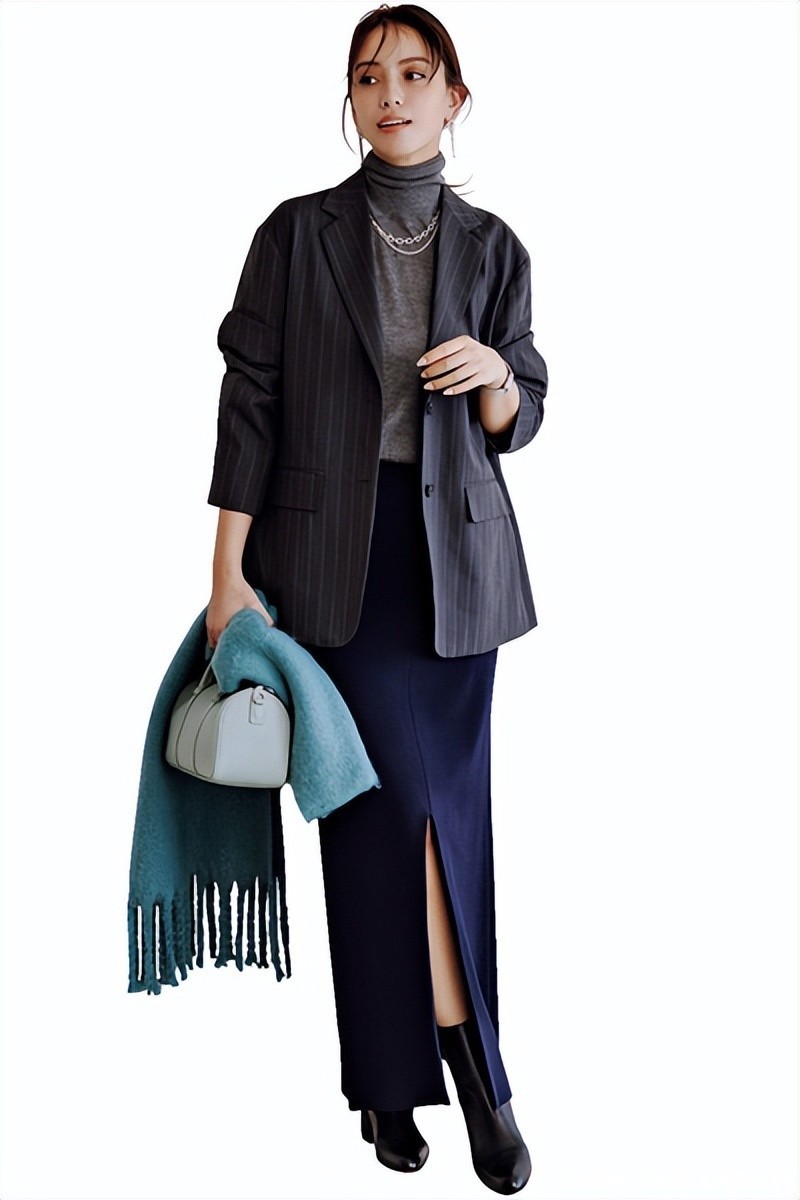 穿搭示范:蓝色真挚裙+竖条纹西装,内搭高领毛衣,一对短靴和项链的点缀,霎时提高级次,照穿既斯文又洋气。