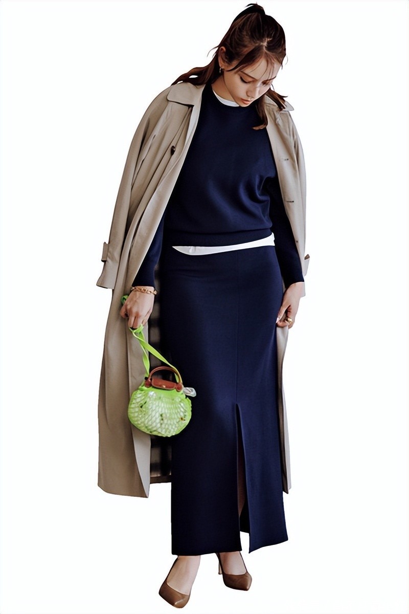 穿搭示范:蓝色真挚裙套装,搭配一件长风衣,未免会有点压身高,关联词搭配一对与大衣同色系的高跟鞋,视觉霎时拉高,达到显高的后果。