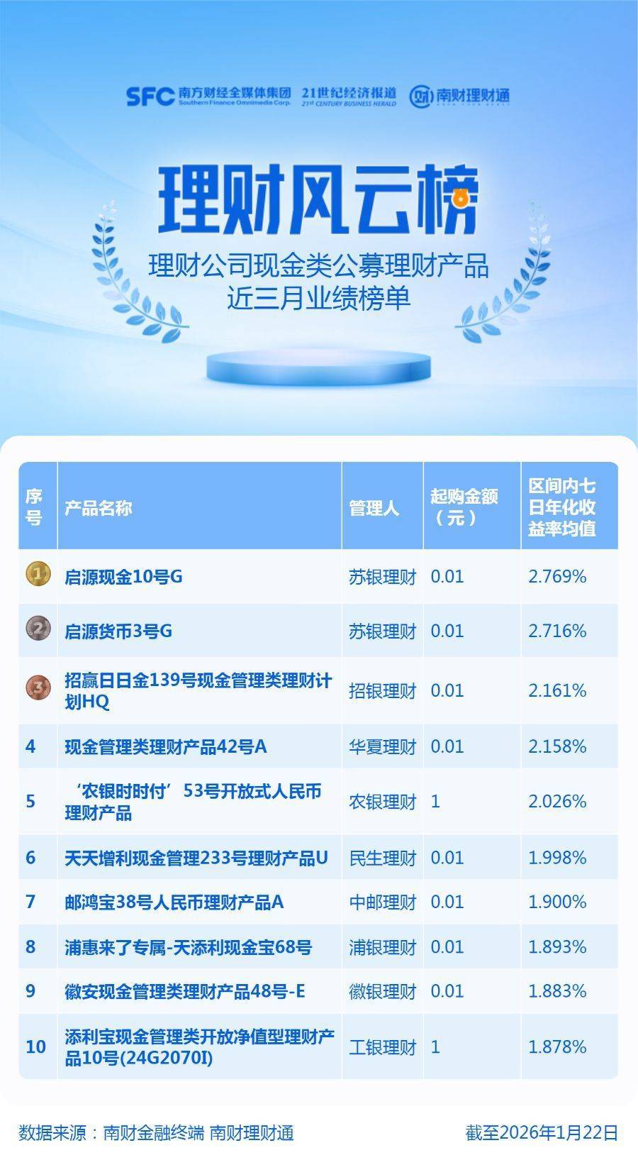 苏银快活两只家具“启源现款10号G”和“启源货币3号G”以及招银快活“招赢日日金139号现款解决类快活探究HQ”纪律位列榜单前三,近3月的七日年化收益率均值离别是2.769%、2.716%、2.161%。