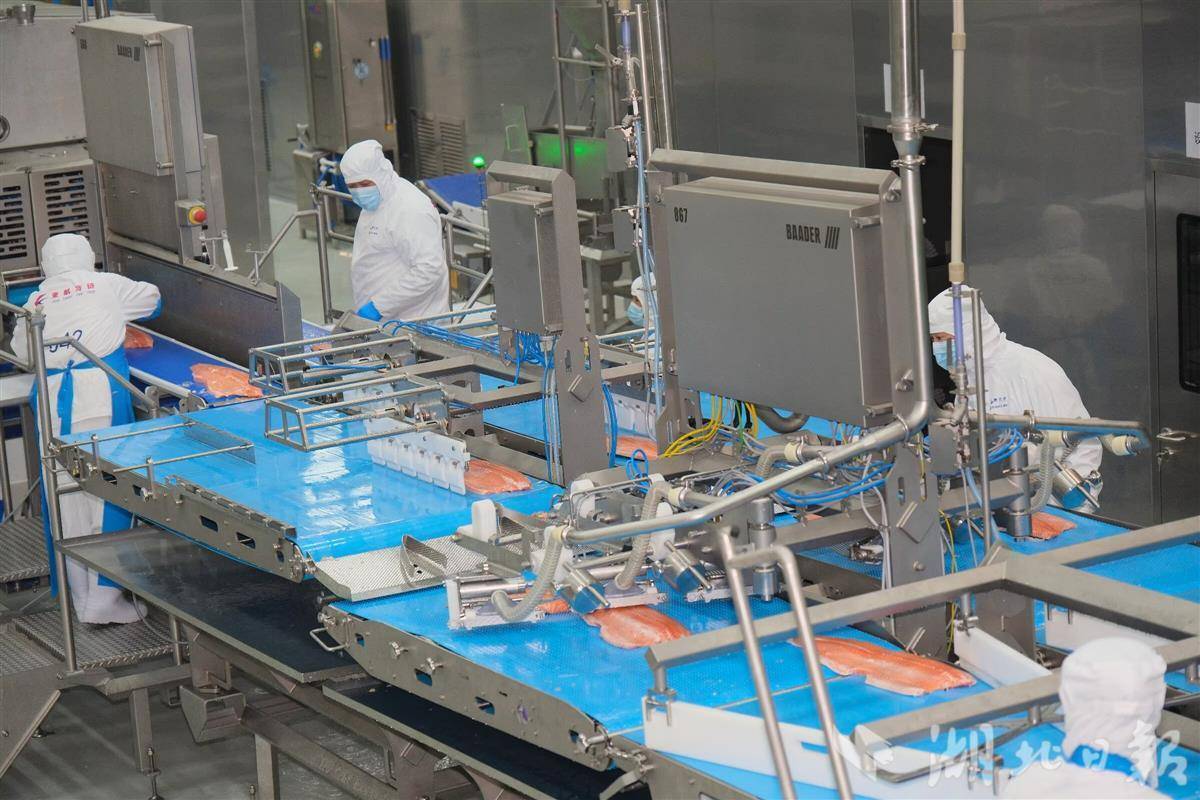 亚洲最大三文鱼智能出产线春节“爆单”。图为忙碌的智能化出产线。湖北日报全媒记者周鹏、通信员刘伟摄